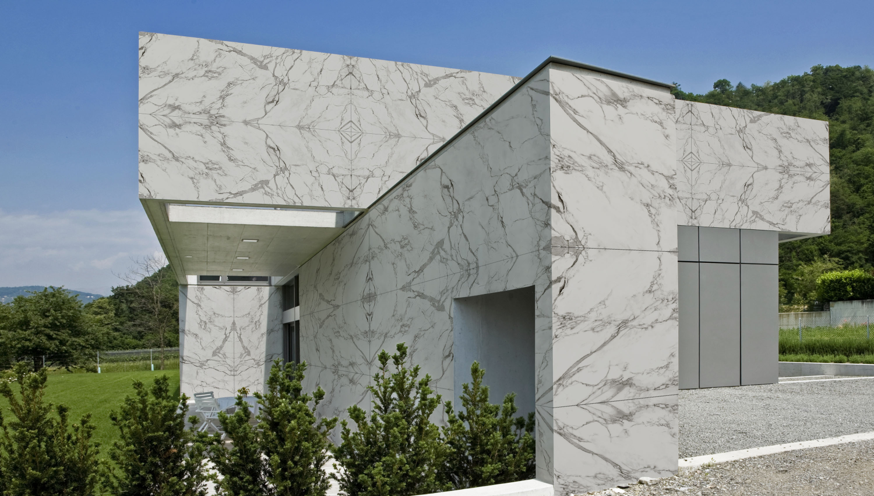 Vi leverer også fasade-plater i keramisk materiale der vi i større prosjekter får disse produsert hos samarbeidspartneren Cosentino.