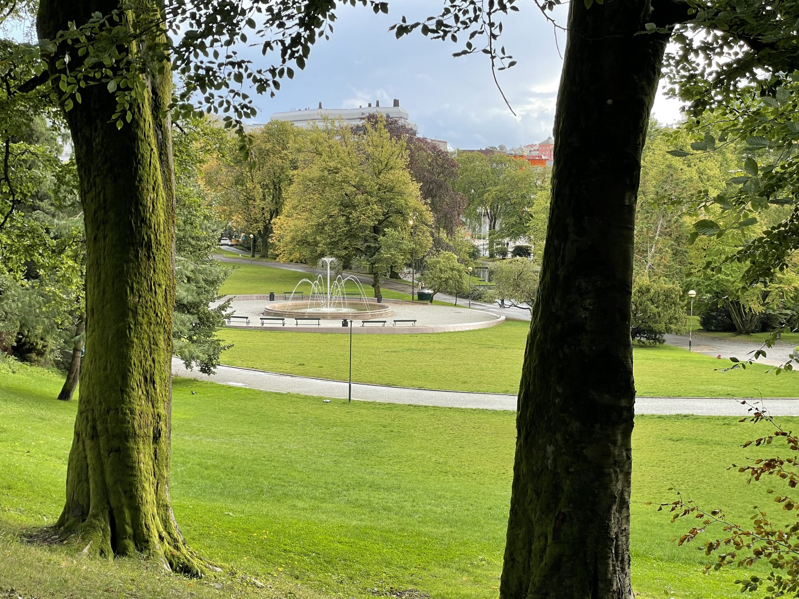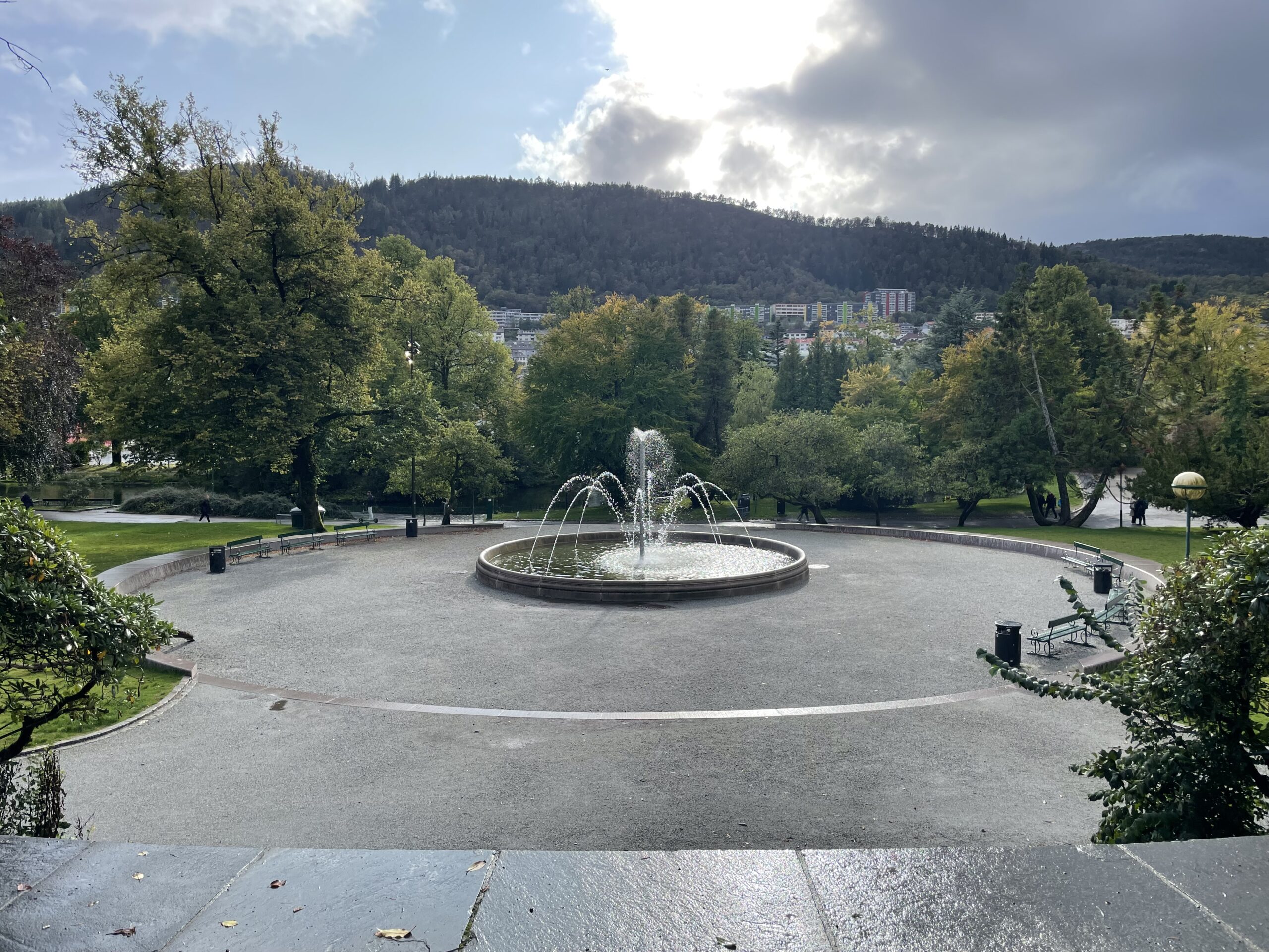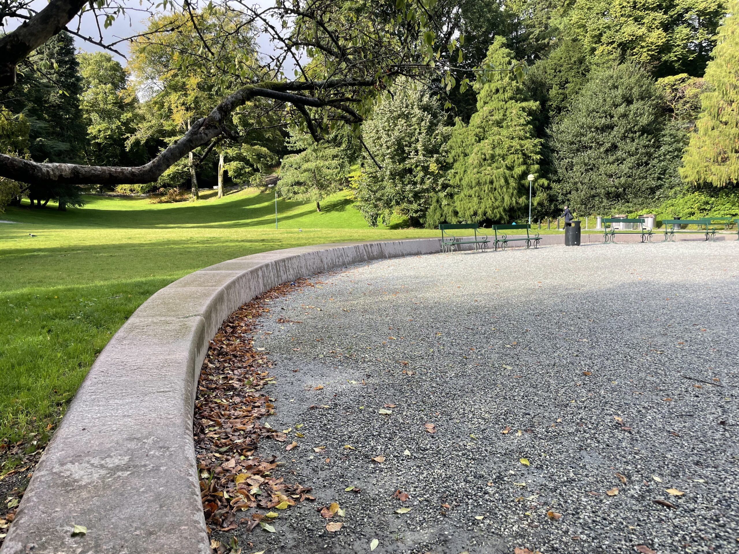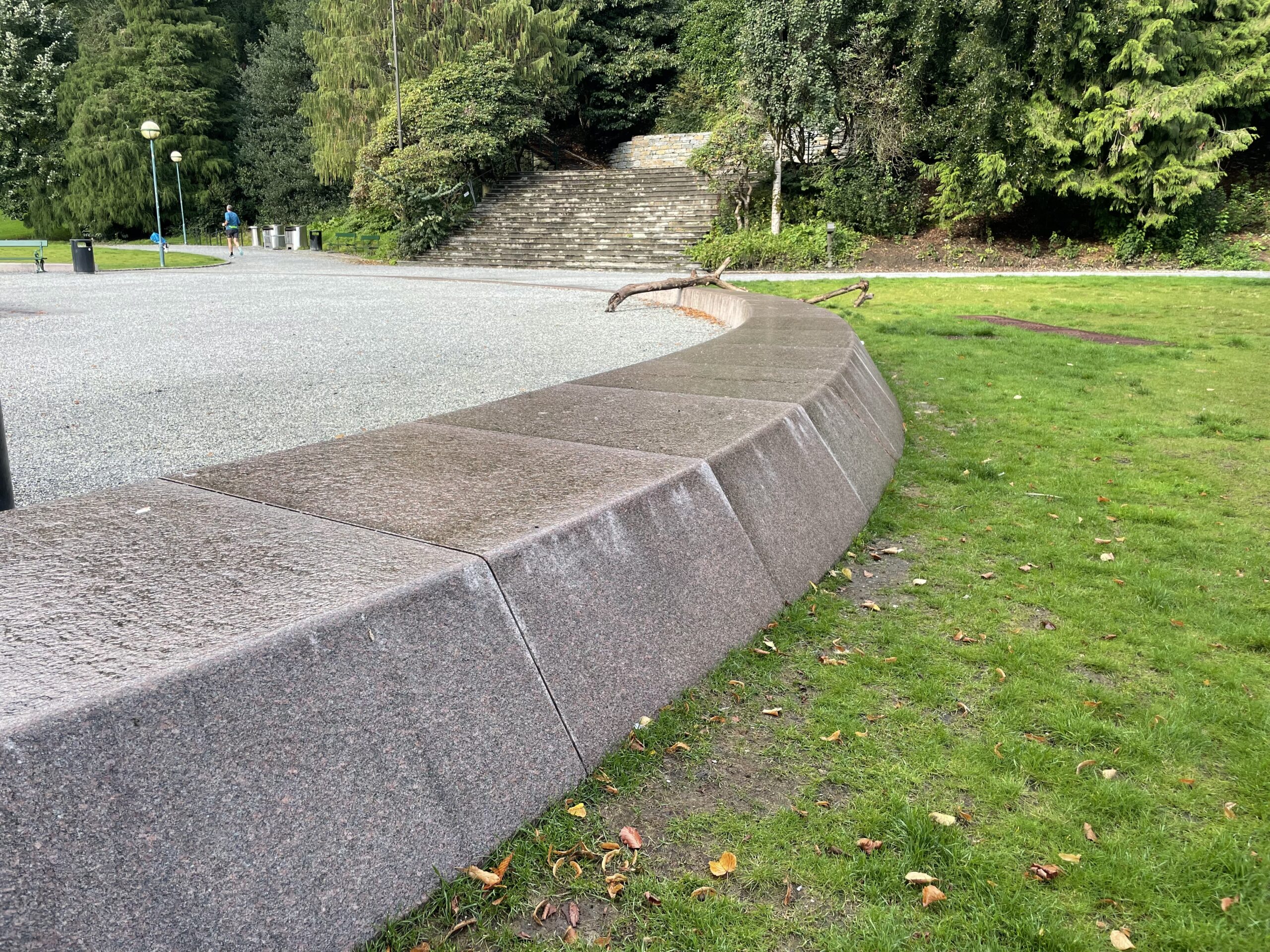 Ringmur i Rød Bohus granitt. Produsert  med håndprikket overflate basert på arkitektens CAD-tegninger. Elementene er kontursaget med diamantwire og har en vekt opp mot 2,5 tonn.