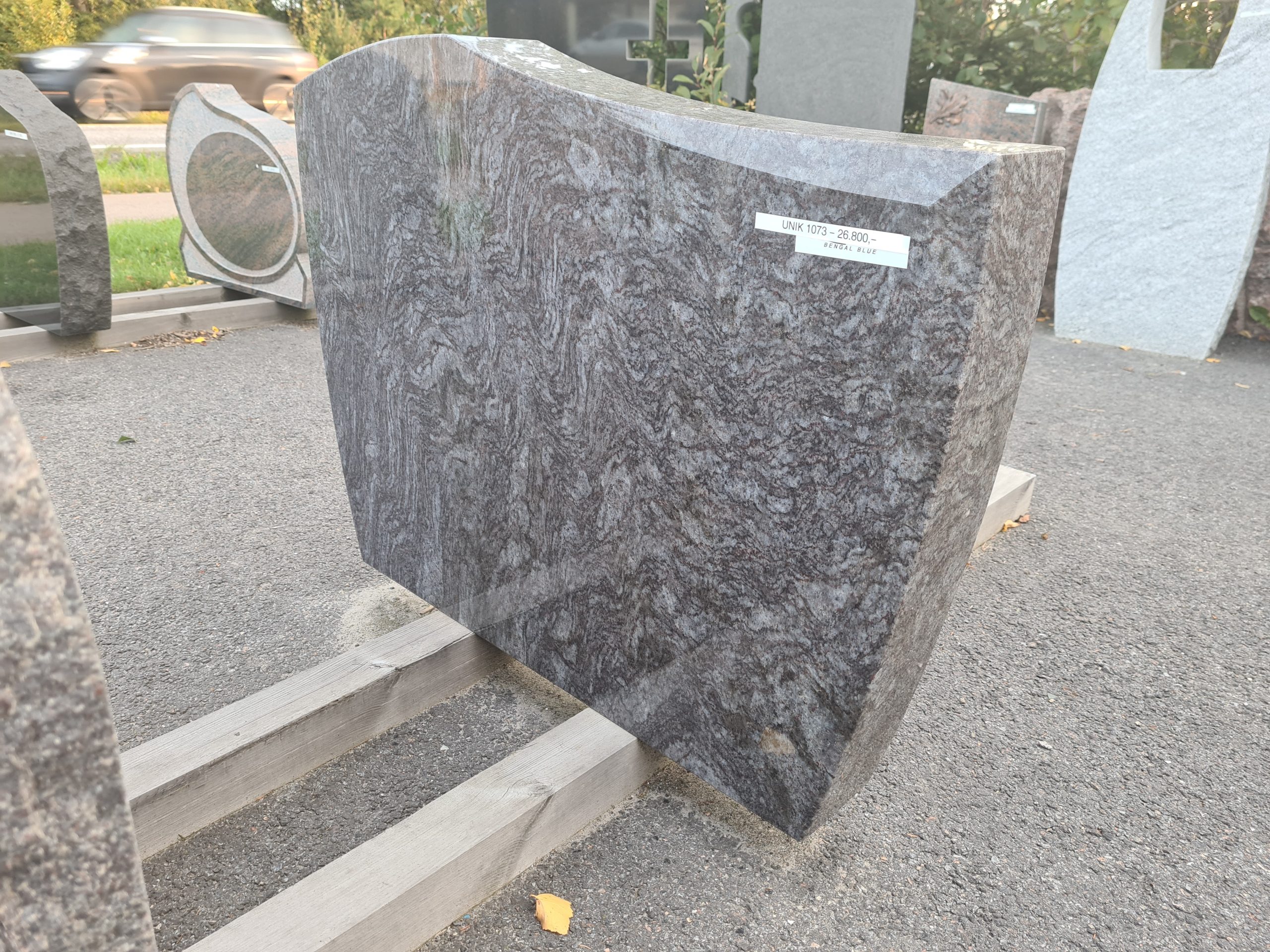 Stor helpolert gravstein modell i mørk blå granitt.
