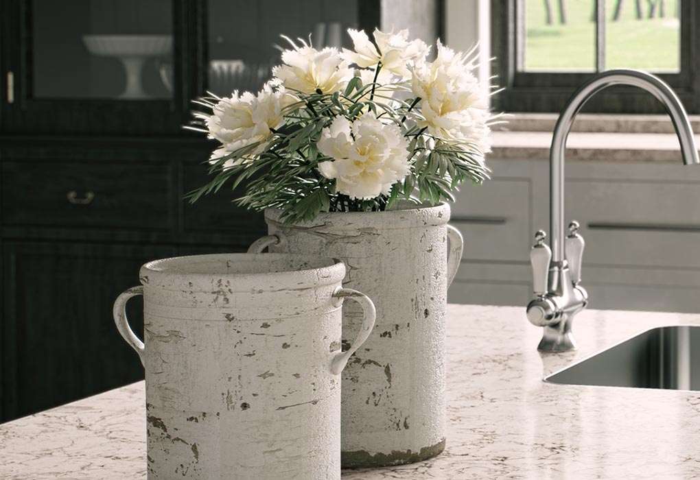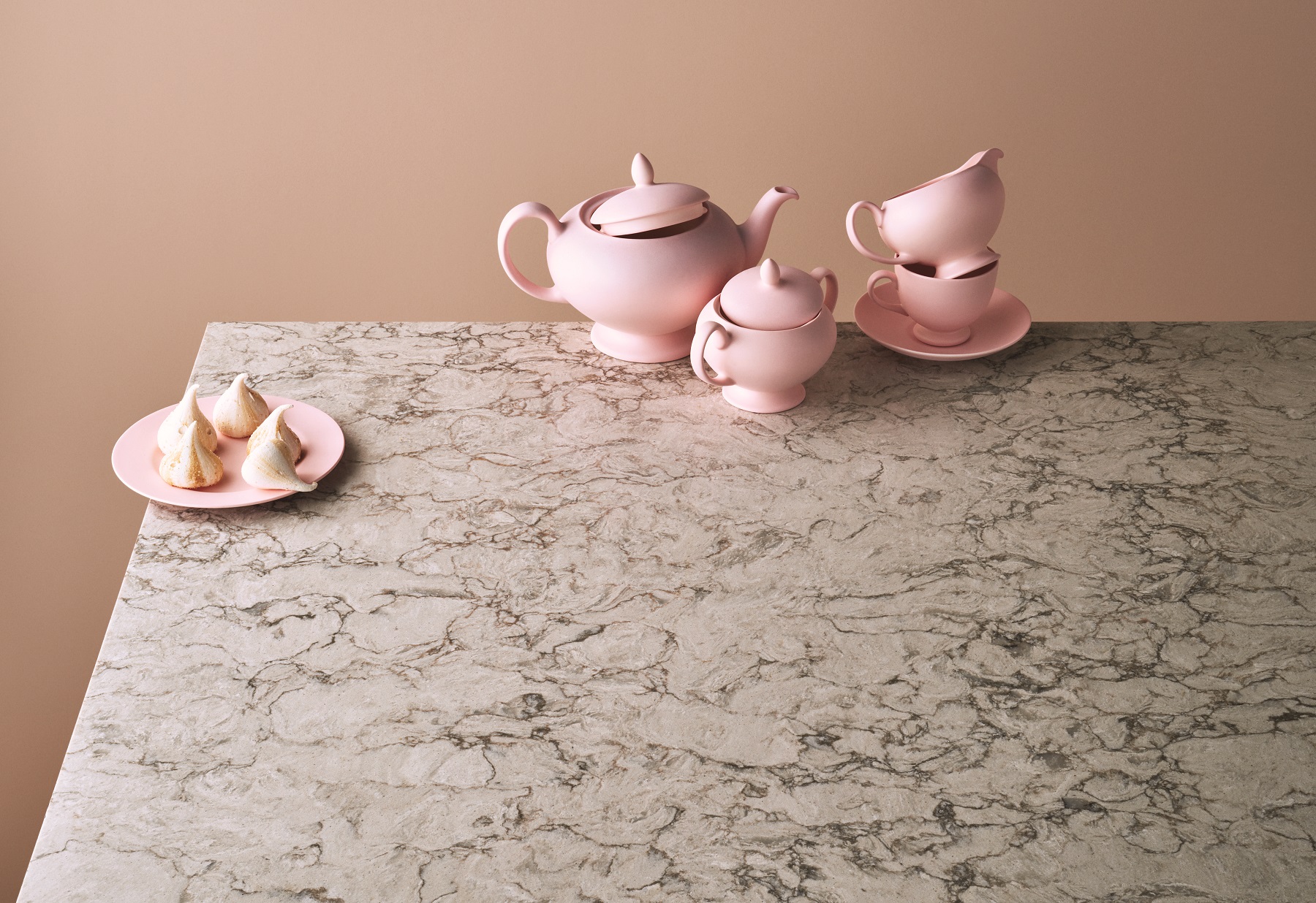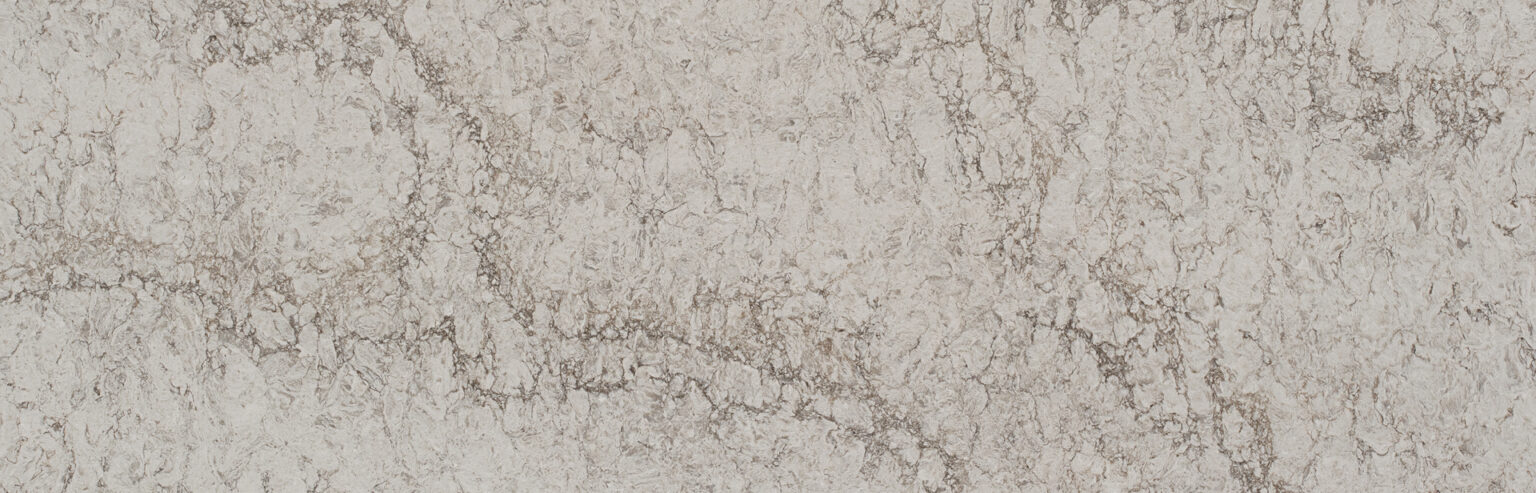 En kremaktig lys overflate, med et snev av brunlige nyanser og virvlende årer i brune og grå fargetoner.