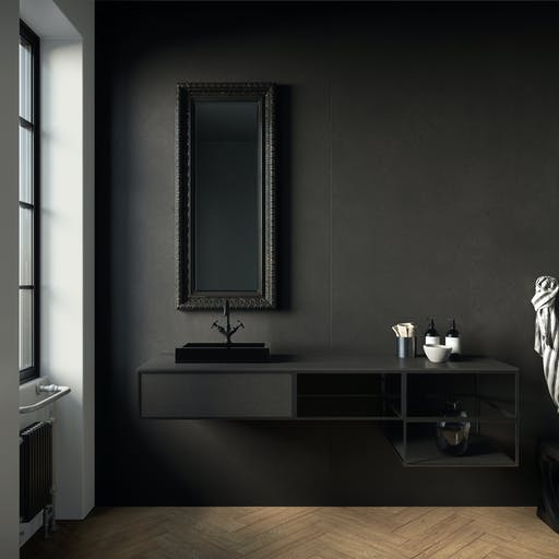 Med sin mørke granittstruktur i svarte og gråtoner har Eter en bakgrunn av milde kontraster, men har likevel en sterk samtidsstemning, noe som gjør den ideell til både innendørs og utendørs bruk.