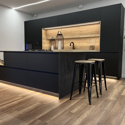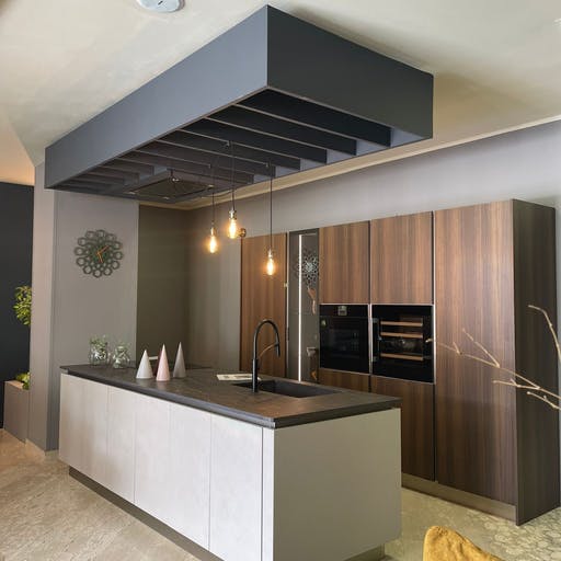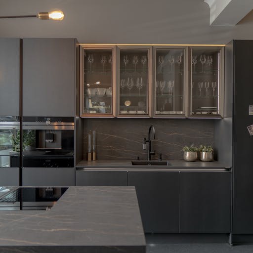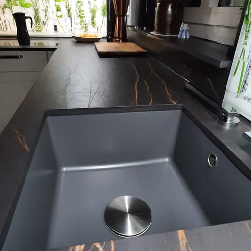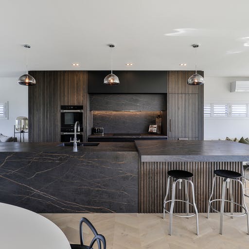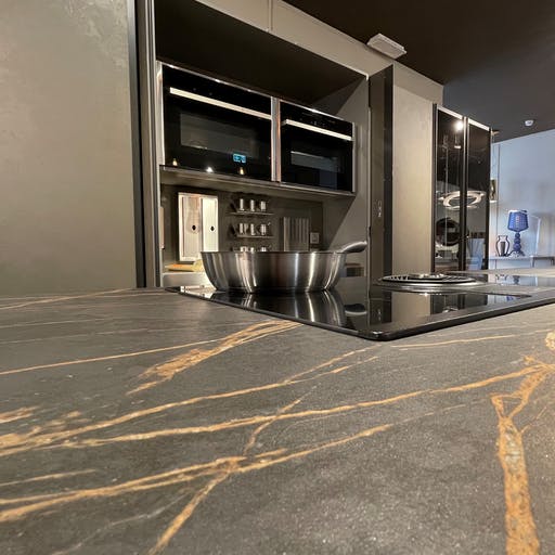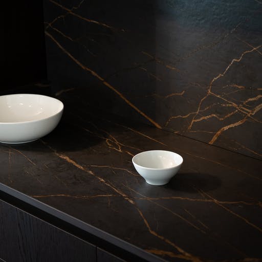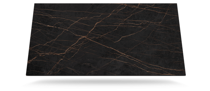Den imponerende fargeveien er inspirert av natursteinen Port Laurent, og har en dramatisk mørk brun bakgrunn krysset med gullårer.