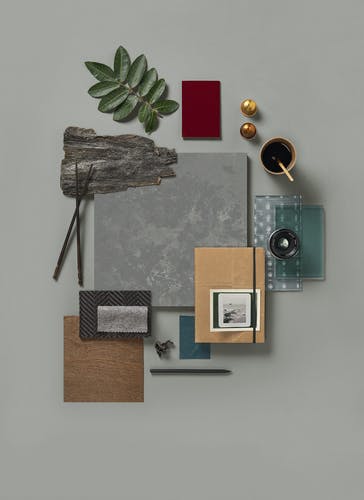 Mørk, slitt sement inspirerer denne fargen, med hvite nyanser som skiller seg ut.